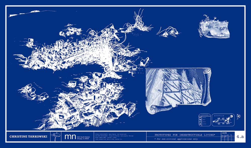 Proposals for Indestructible Living Posted by Blueprints 4a, 36”h x 64”h, blueprint on paper, mn gallery, Chicago, 2004