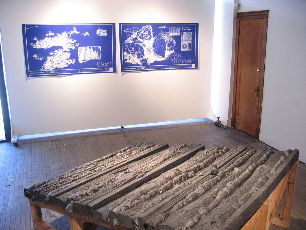 Iron Roof, cast iron, wood, 18”-32”h x 81”l x 67”w, Blueprints 1-5, 36”h x 64”h, blueprint on paper, mn gallery, Chicago, iron produced at the Kohler Company, Kohler WI, 2004